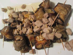 Blend the salt, the pine nuts, the breadcrumbs, 3 slices of aubergine and a few tuna pieces together.