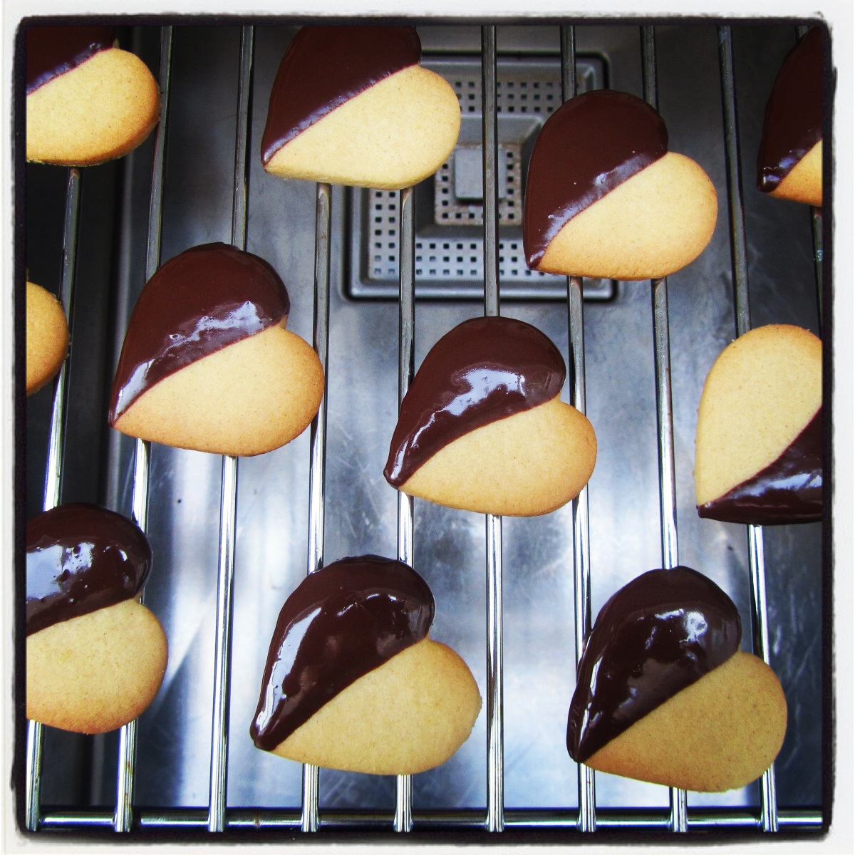 Cool the cookies completely on a wire rack. Then, for the sandwich cookies: dust the open centred hearts with icing sugar, spread your nutella on the bottom ones and place the open heart on top to form a sandwich. For the smaller ones, dip half of the cookie in melted chocolate and allow to drain off the excess on a wire rack.